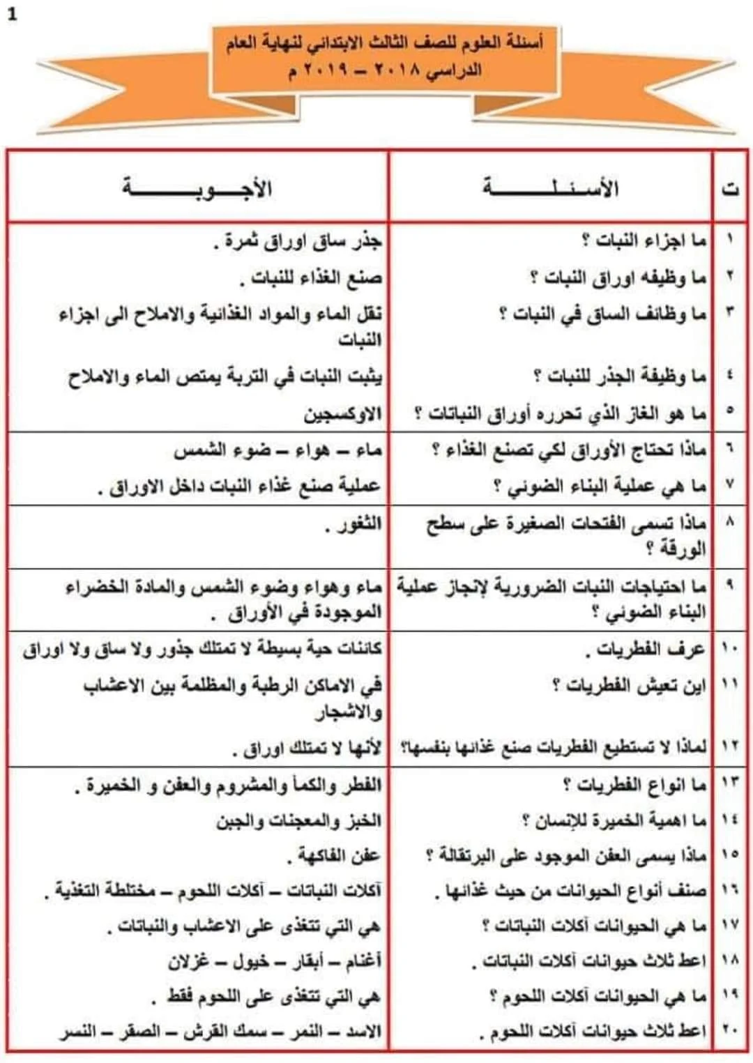 مختصر بشكل اسئلة واجوبه لمادة علوم صف الثالث ابتدائي ثابت لكل السنوات والاسئله المهمه في الامتحانات اليوميه والشفهيه والشهريه ونصف السنه واخر السنه