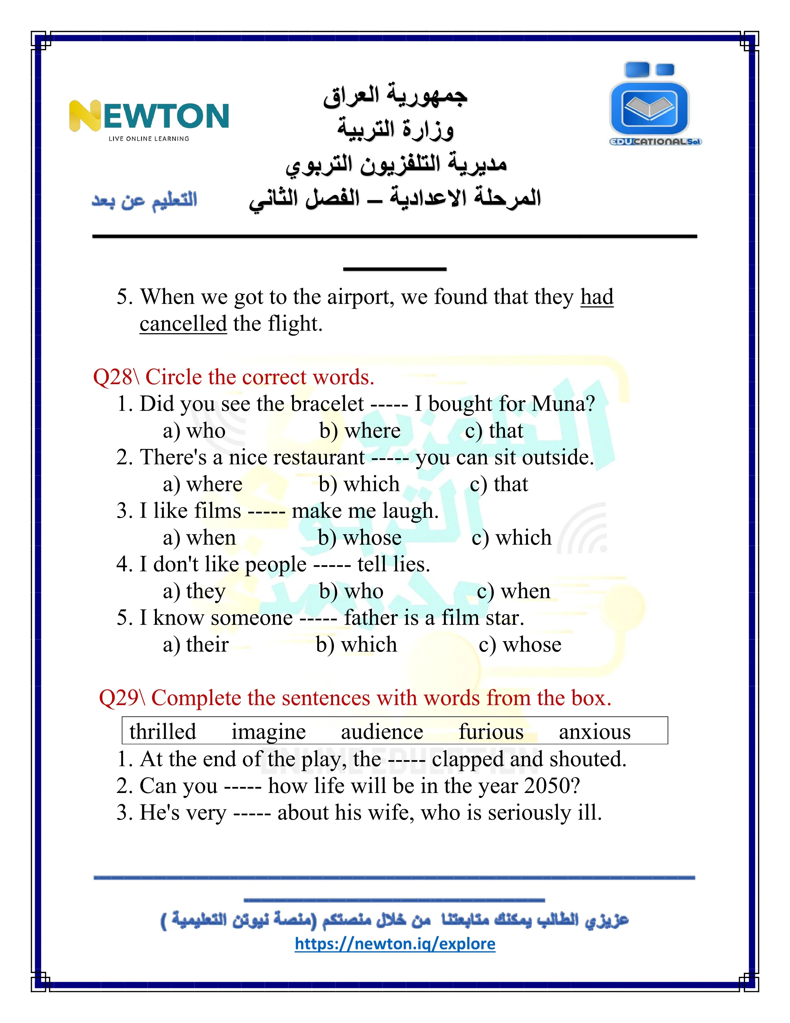 اسئله لجميع المواد للتلفزيون التربوي الكترونيه الخاصه بالدراسه الاعداديه