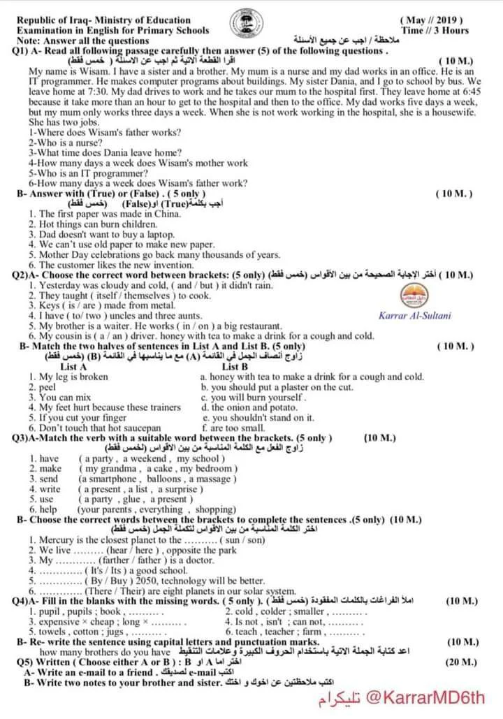 نماذج بنمط وزاري لاختبار طلبة السادس الابتدائي لمادة اللغه الانكليزيه لكل السنوات للاستاذ كرار السلطاني لسنه 2022 - 2021