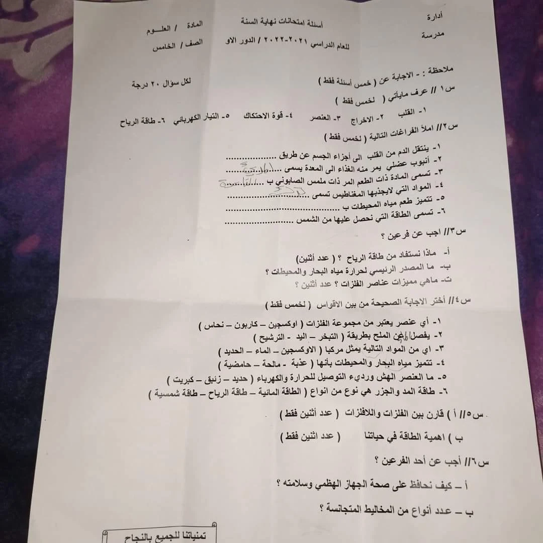 اسئلة اخر السنة علوم خامس ابتدائي اكثر من نموذج