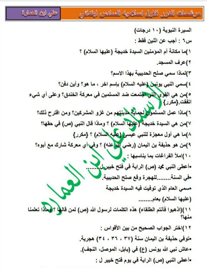مرشحات مهمه لمادة التربيه الاسلاميه للامتحانات الوزاريه
