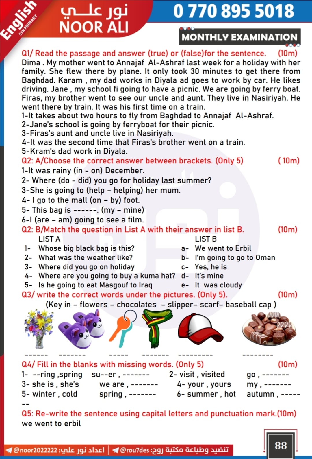 اسئلة انكليزي شهريه لصف الخامس الابتدائي والخاص باليونت السابع للست نور علي