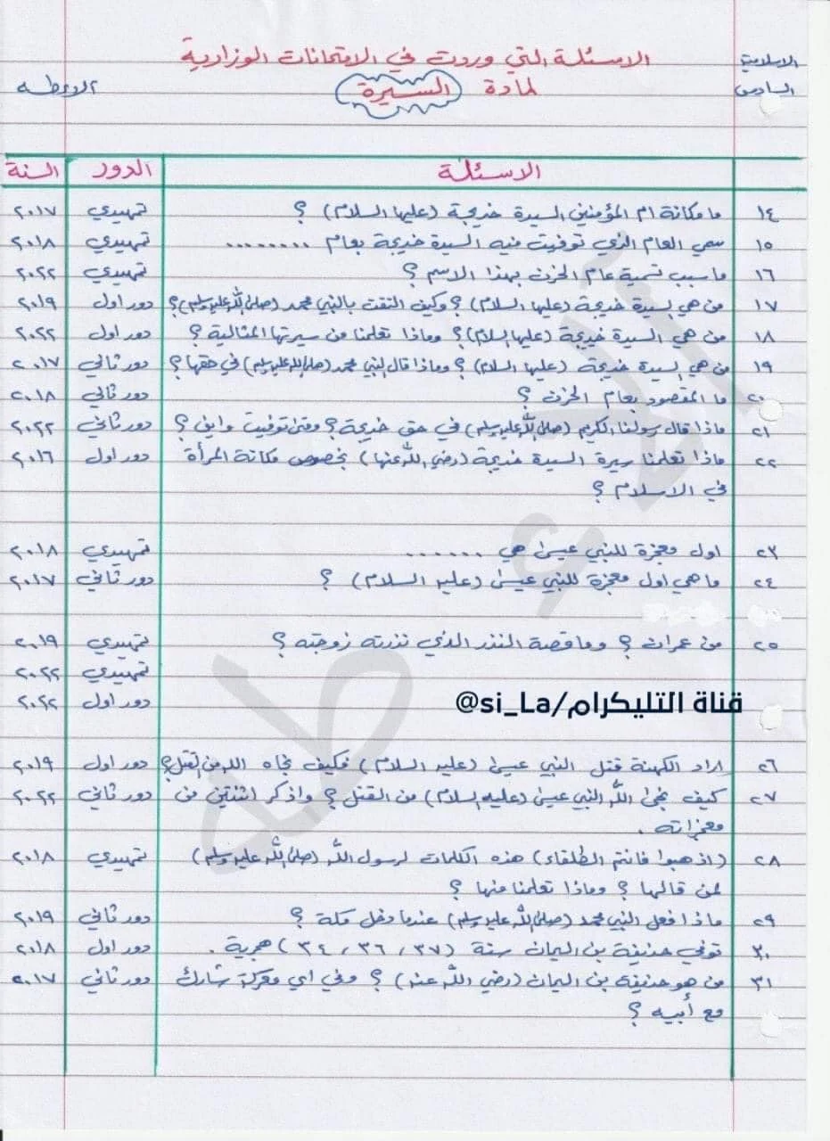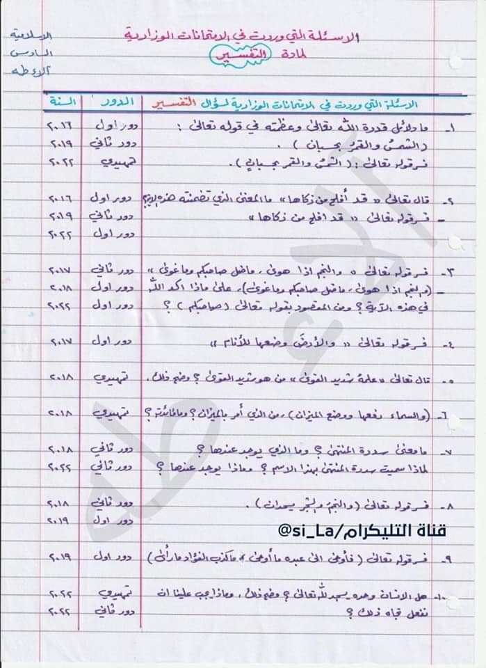 ملاحظه :- الاعوام (٢٠١٧ و ٢٠١٨ و ٢٠١٩ و ٢٠٢٢) التمهيدي والدور الأول والدور الثاني لمادة التفسير والعقيدة والعبادات والسيرة والآداب , وكذلك العام (٢٠١٦) الدور الأول بعضاً منها، لأن الكتاب كان يختلف إلّا في بعض المواضيع , أما عام (٢٠٢٠ و ٢٠٢١) فلم يكن الامتحان وزارياً .