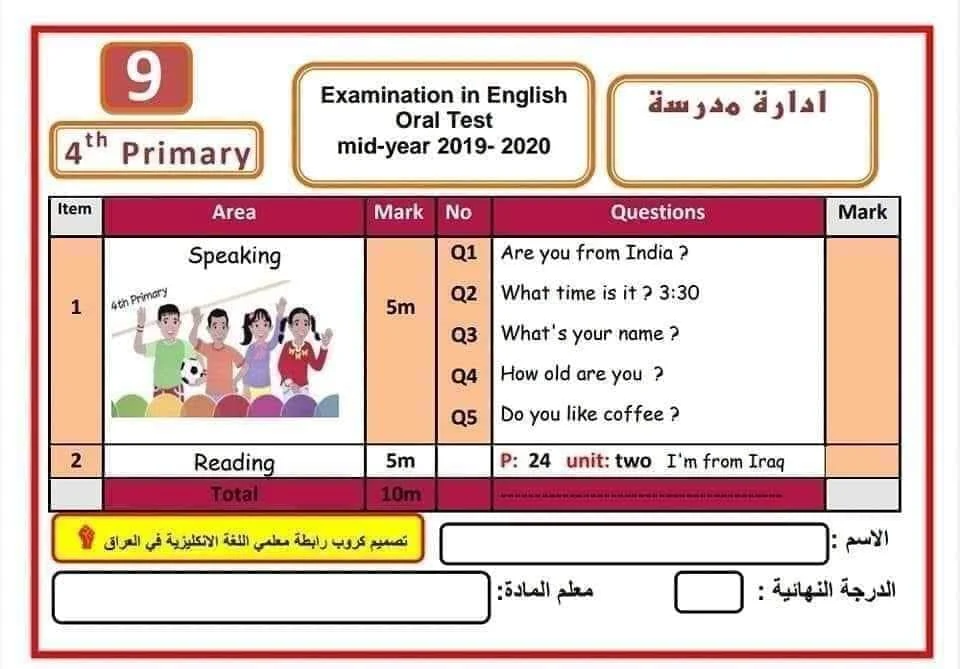 جميع قصاصات امتحانات الشفهي لصف الرابع ابتدائي لمادة اللغة الانكليزية