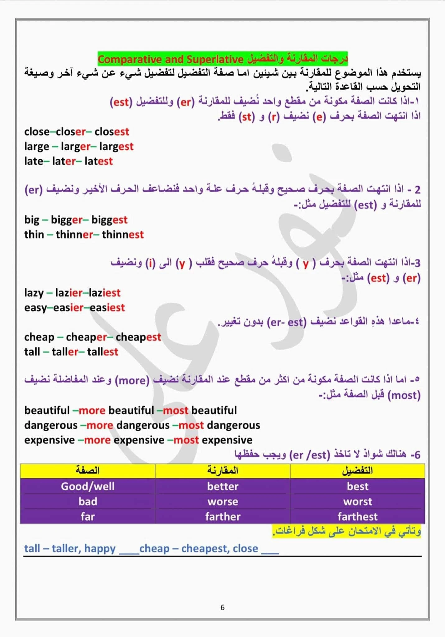الاملاء لصف السادس الابتدائي لـ ( الاضافات, الاختصارات, المعاكسات, الحروف المفقودة ) في مادة اللغة الانكليزي من اعداد الست نور علي , عليها 10 درجات في الامتحانات الوزارية , مكون من 7 صفحات