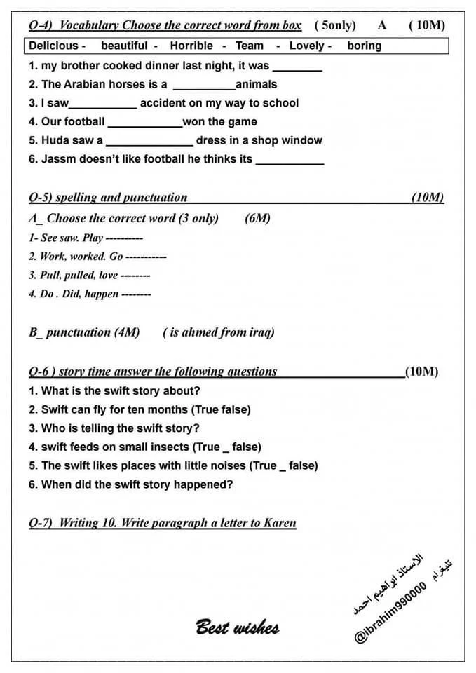 اسئلة الانكليزي E للشهر الاول والثاني والثالث لصف الاول متوسط مع الحلول