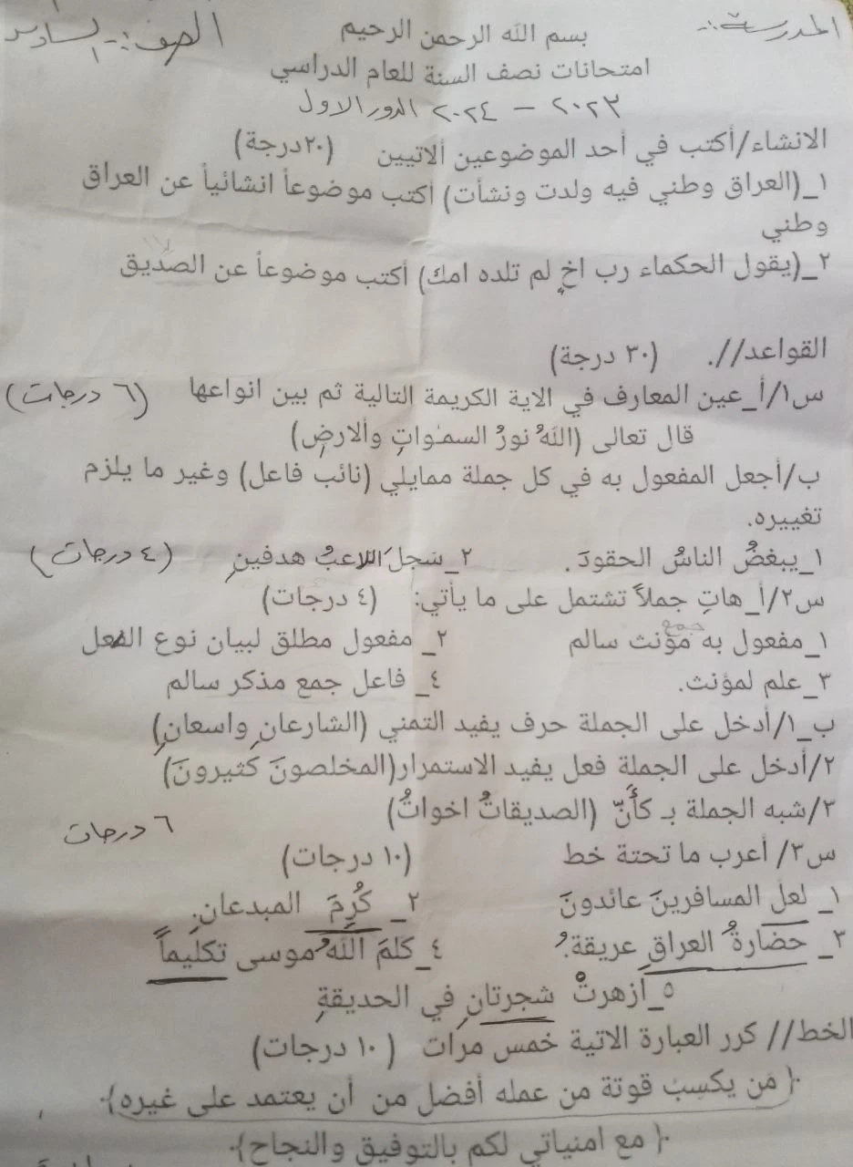 اسئلة نصف السنه 2023 - 2024 الدور الاول
