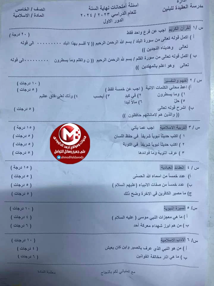 نماذج امتحانات اخر السنه في مادة الاسلامية صف الخامس ابتدائي للعام 2023-2024 مكون من (11) نموذج من مدارس عدة في العراق .