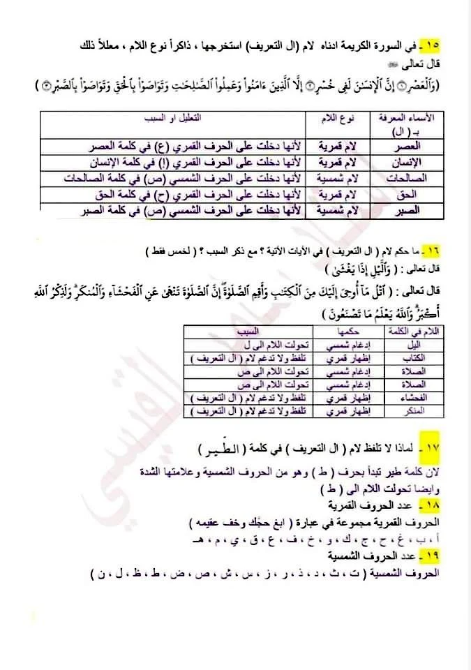 لتلاميذ السادس الابتدائي أسئلة خاصة بأحكام التلاوة لام (ال التعريف) وآداب تلاوة القرآن الكريم مع الأجوبة.
